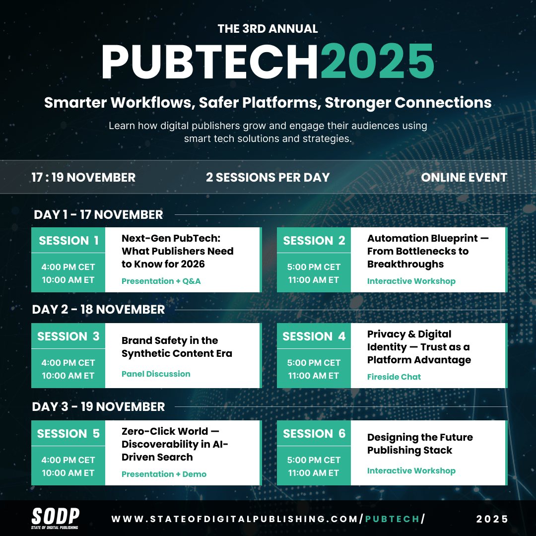 AI is moving from experimentation to becoming embedded in news operations. Meanwhile, misinformation, deepfakes, and unsafe ad placements have pushed brand safety to boardroom priority, while zero-click environments make it harder to control content discovery. Over three days, industry leaders and technologists will gather for targeted sessions and practical workshops. Topics include Next-Gen PubTech trends for 2026 with IBM's Anabelle Nicoud, automation blueprint workshops, brand safety in synthetic content, privacy and digital identity strategies, zero-click world optimization, and designing future publishing stacks with Stanford's Eric Ulken. The event features 10+ panelists and expects 300+ digital publishing professionals from around the world.